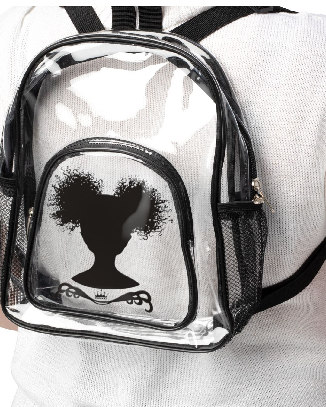Introducing a must-have Clear Afro Puff Gurl Stadium Backpack, perfect for stylishly carrying your essentials while ensuring compliance with stadium regulations. This trendy backpack, crafted from durable, water-resistant PVC, offers a sleek, modern aesthetic that makes it an ideal companion for sporting events, concerts, and festivals. With its substantial interior space and convenient zipper closure, it seamlessly fits into the active lifestyle of children and adults. Great gift for sports enthusiasts or anyone looking to make a statement at events. Celebrate game days and outdoor adventures with this fashionable accessory!
